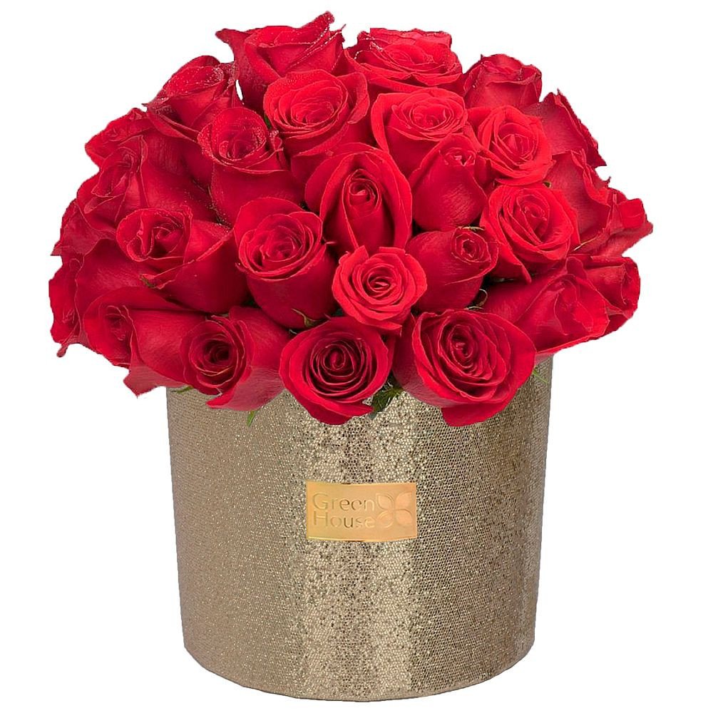 Exclusivo arreglo floral de 36 rosas en florero de cerámica decorativa Glam dorada. 35 cm. Alto. Color de las rosas según su elección.