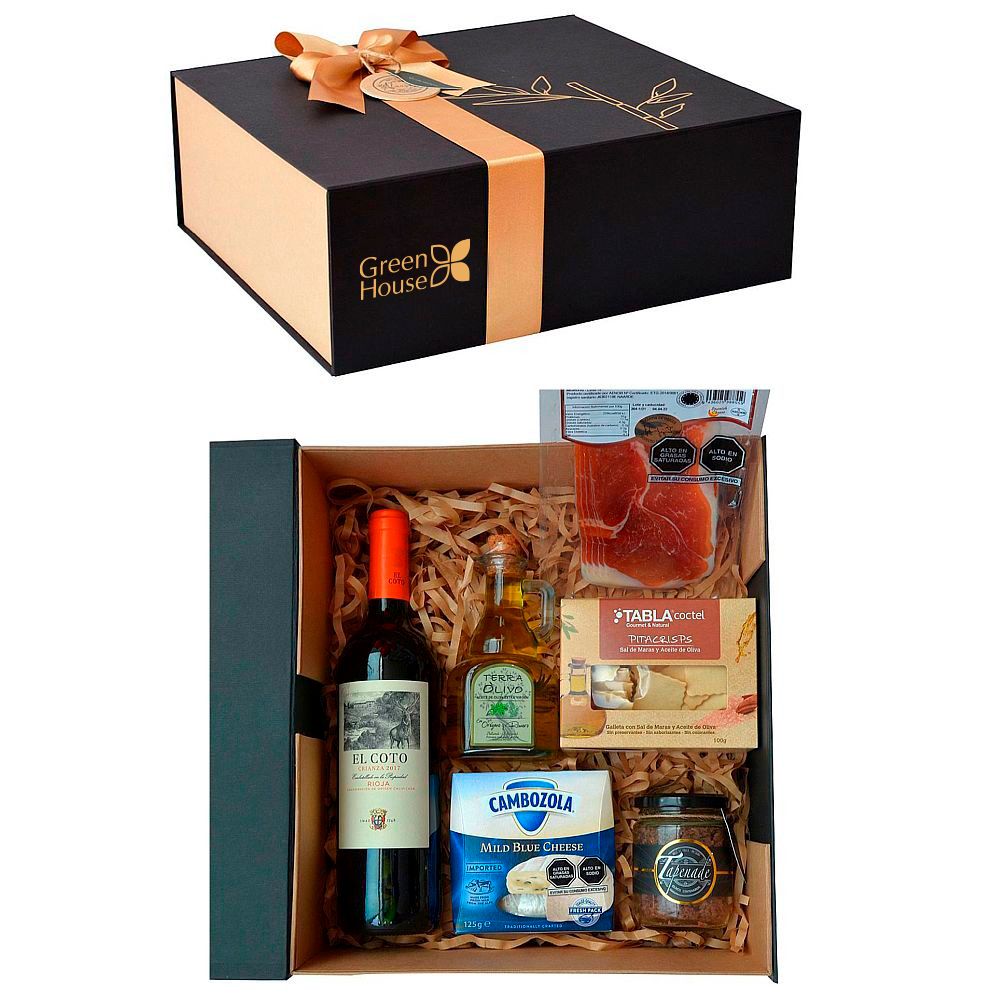 Contiene: 1 Vino tinto español El Coto - Crianza (750 ml.), 1 Jamón serrano español marca La Leyenda (100 gr.), 1 Jarrita de aceite de oliva extra virgen con orégano y romero marca Terra Olivo (250 gr.), 1 Queso Cambozola Mild Blue Cheese (125 gr.), 1 Tapenade especial de aceituna botija con quinua (210 gr.), 1 Caja de galletitas pitacrisps con sal de maras y aceite oliva marca Tabla (100 gr.). En exclusivo box color negro (35 cm. x 31 cm.).