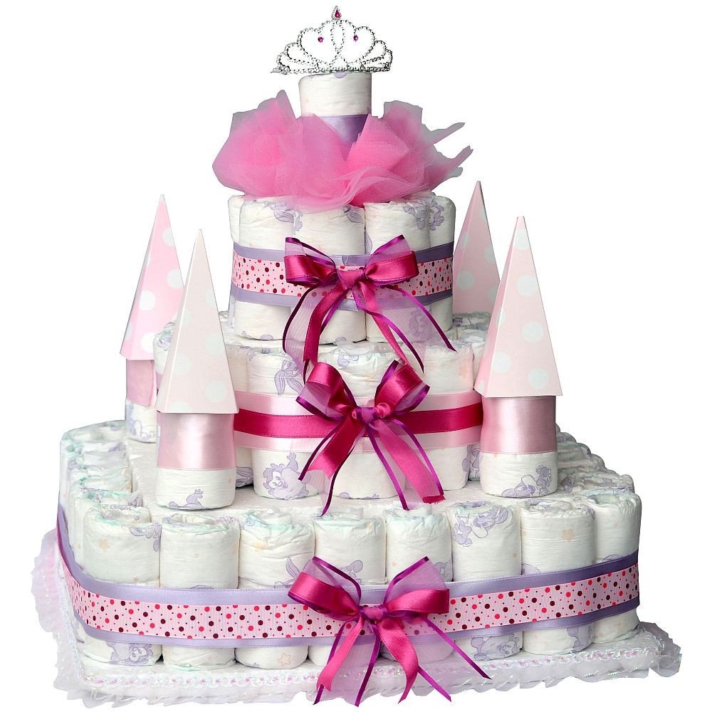 Delicado castillo elaborado con pañales, acompañado de peluche.
