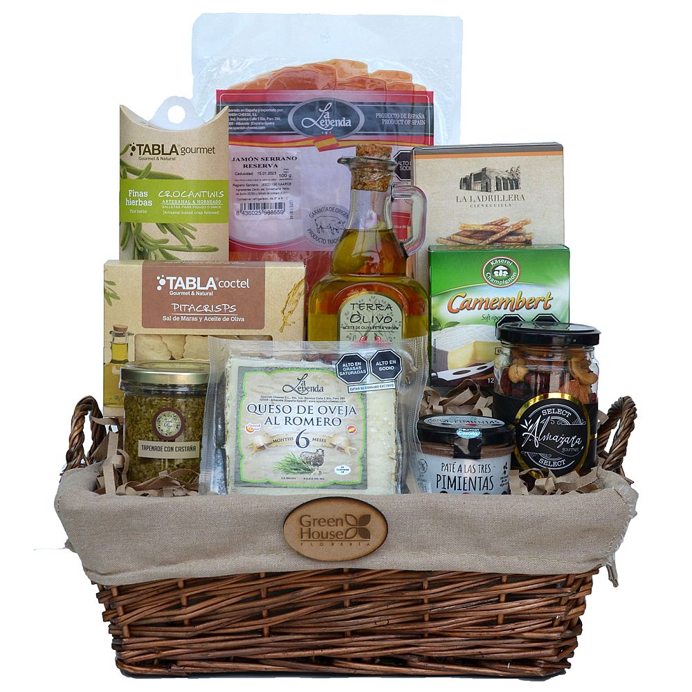 Contiene: 1 Jamón serrano español marca La Leyenda (100 gr.), 1 Jarrita de aceite de oliva extra virgen con orégano y romero (250 gr.), 1 Queso camembert marca Prestige (125 gr.), 1 Queso de Oveja al Romero marca La Leyenda (150 gr.), 1 Tapenade especial de aceituna botija y castañas (210 gr.), 1 Paté español a las 3 pimientas marca Pata Negra (110 gr.), 1 Frasco con mix de frutos secos premium (210 gr.), 1 Caja de pretzels artesanales La Ladrillera (110 gr.), 1 Caja de galletitas pitacrisps con sal de maras y aceite oliva marca Tabla (100 gr.), 1 Tostaditas artesanales de finas hierbas marca Tabla Gourmet (40 gr.). En delicada cesta de mimbre.