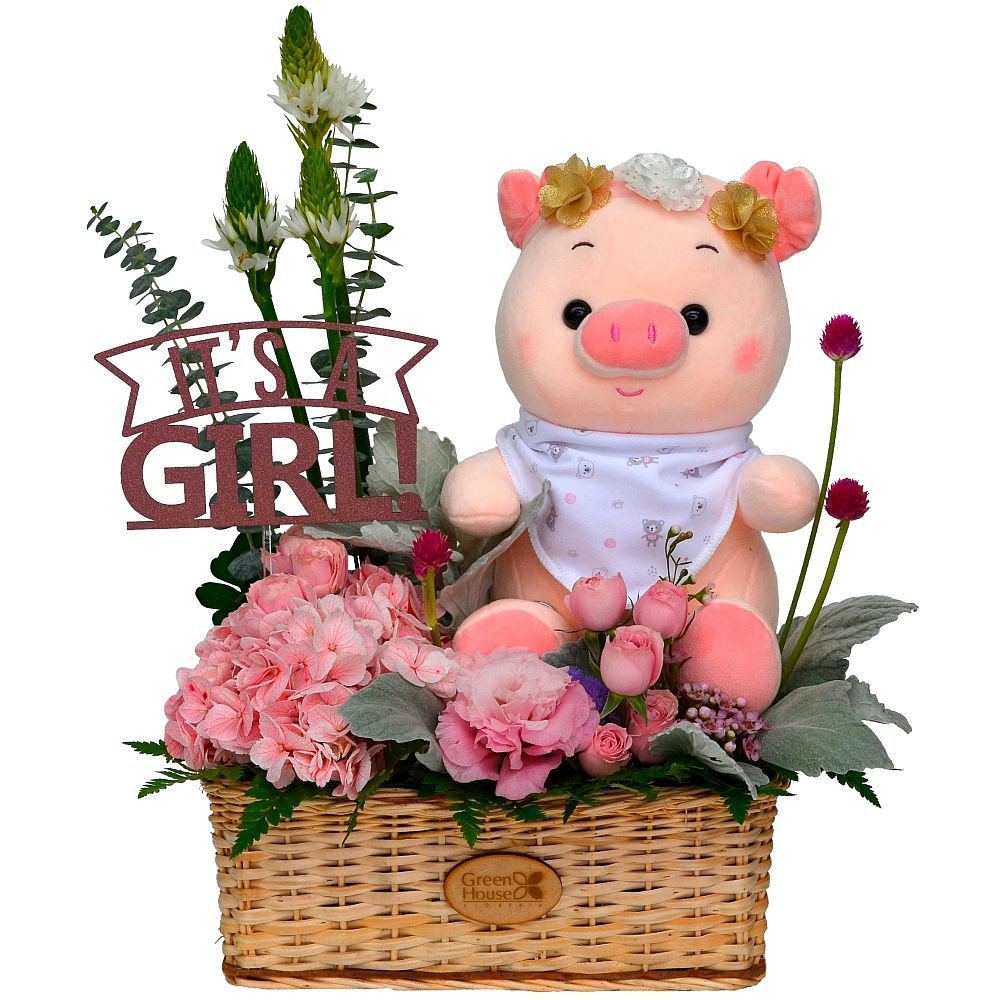 Delicada cesta con flores variadas y follaje fino en canasta de mimbre, acompañados de una chanchita de peluche con babero de algodón y un topper It´s a Girl. Elaborada en canasta de mimbre. 45 cm. Alto.