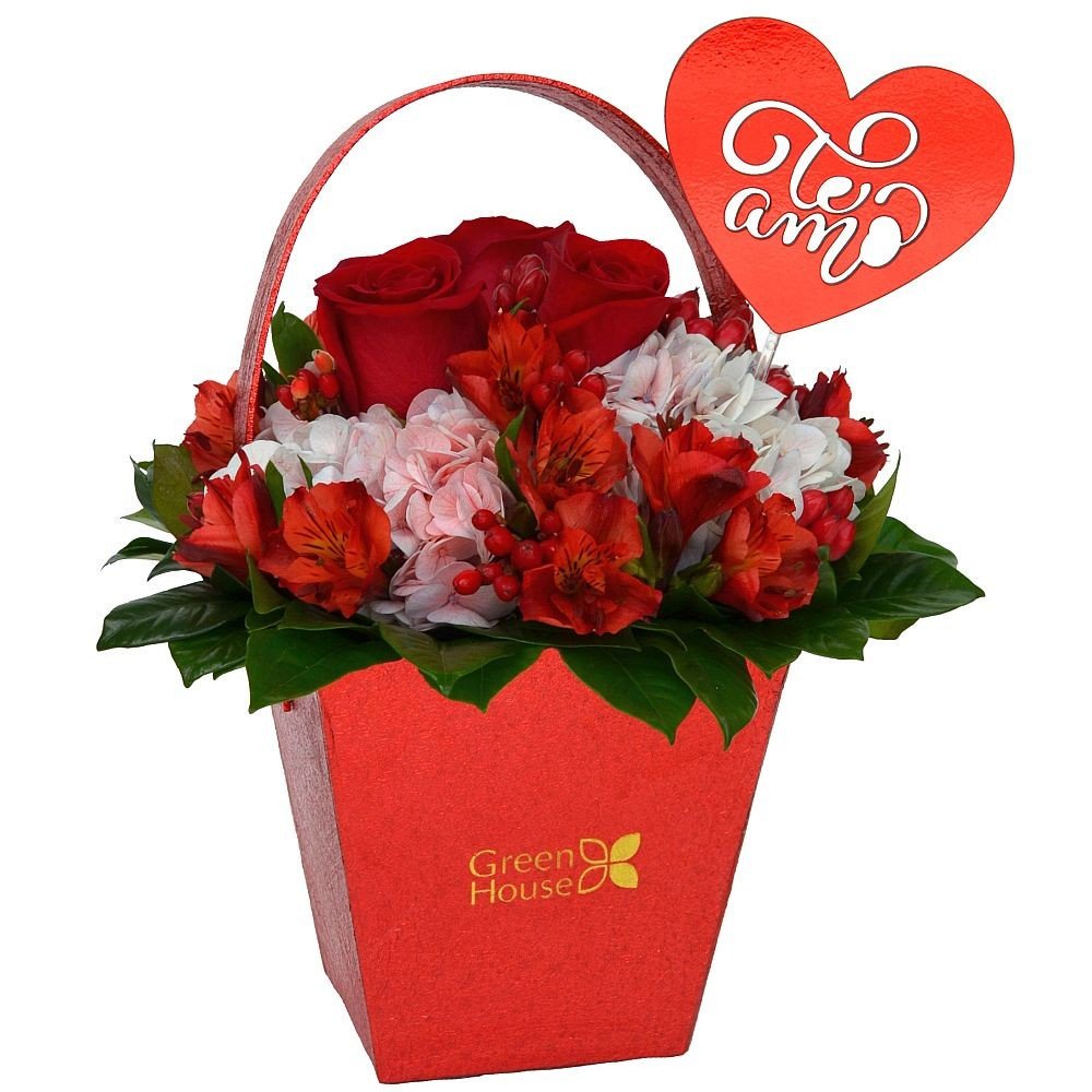 Romántico arreglo de rosas, hortenias, astromelias y follaje fino, decorado con un topper paleta Te Amo. Elaborado en cesta roja. 35 cm. Alto.
