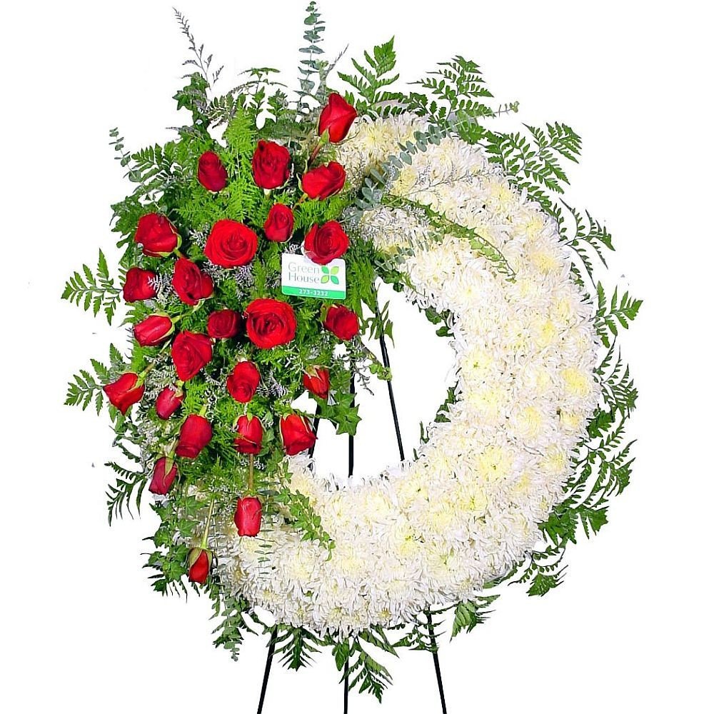 Elegante corona de defunción compuesta por 24 rosas y follaje fino. En pedestal de fierro. Color de las rosas según elección. 1.95 mt. alto.