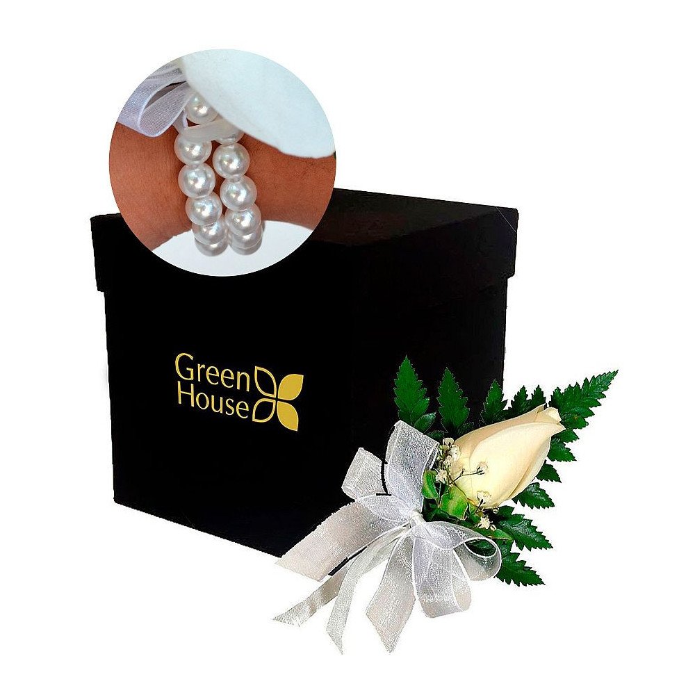 Corsage de 1 rosa decorada con cinta organza y follaje fino. Elaborada en muñequera especial elástica de perlas. En caja decorativa Luxury negra.