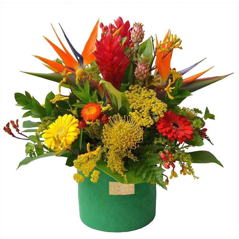 Alegre arreglo floral compuesto por aves del paraíso, gerberas, proteas, gingers, piñas y follaje fino. En florero de cerámica decorativa Colección Amazónía. 50 cm. Alto.