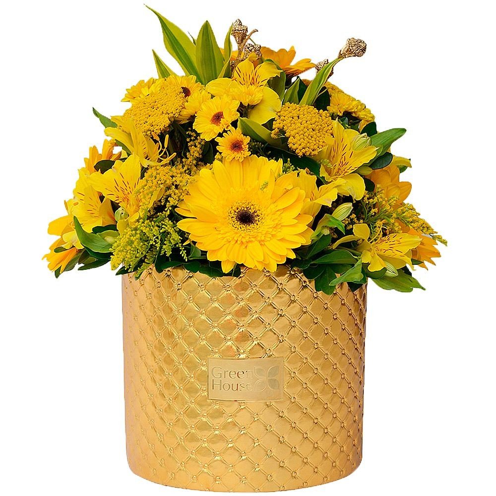Exclusivo arreglo floral de gerberas, astromelias, flores variadas y follaje fino, en florero de cerámica decorativa Glam dorada. 35 cm. Alto.