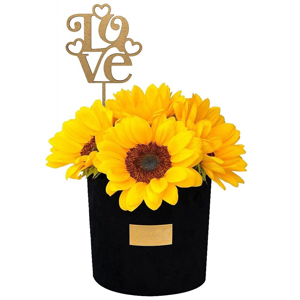 Delicado arreglo de girasoles, acompañado de topper Love, en florero de cerámica decorativa Colección Glam.