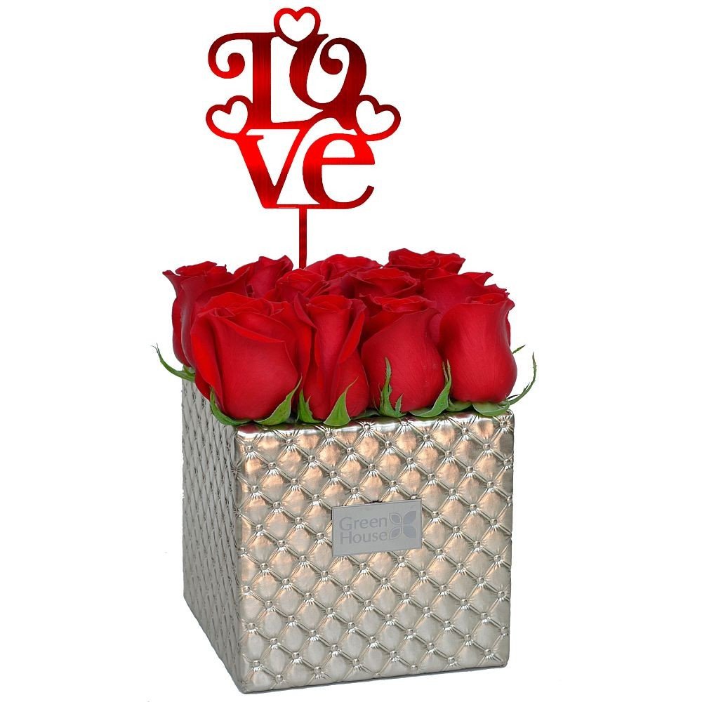 Exclusivo arreglo floral de 12 rosas en florero de cerámica decorativa Glam dorada, acompañada de topper Love. Color de rosas según elección.