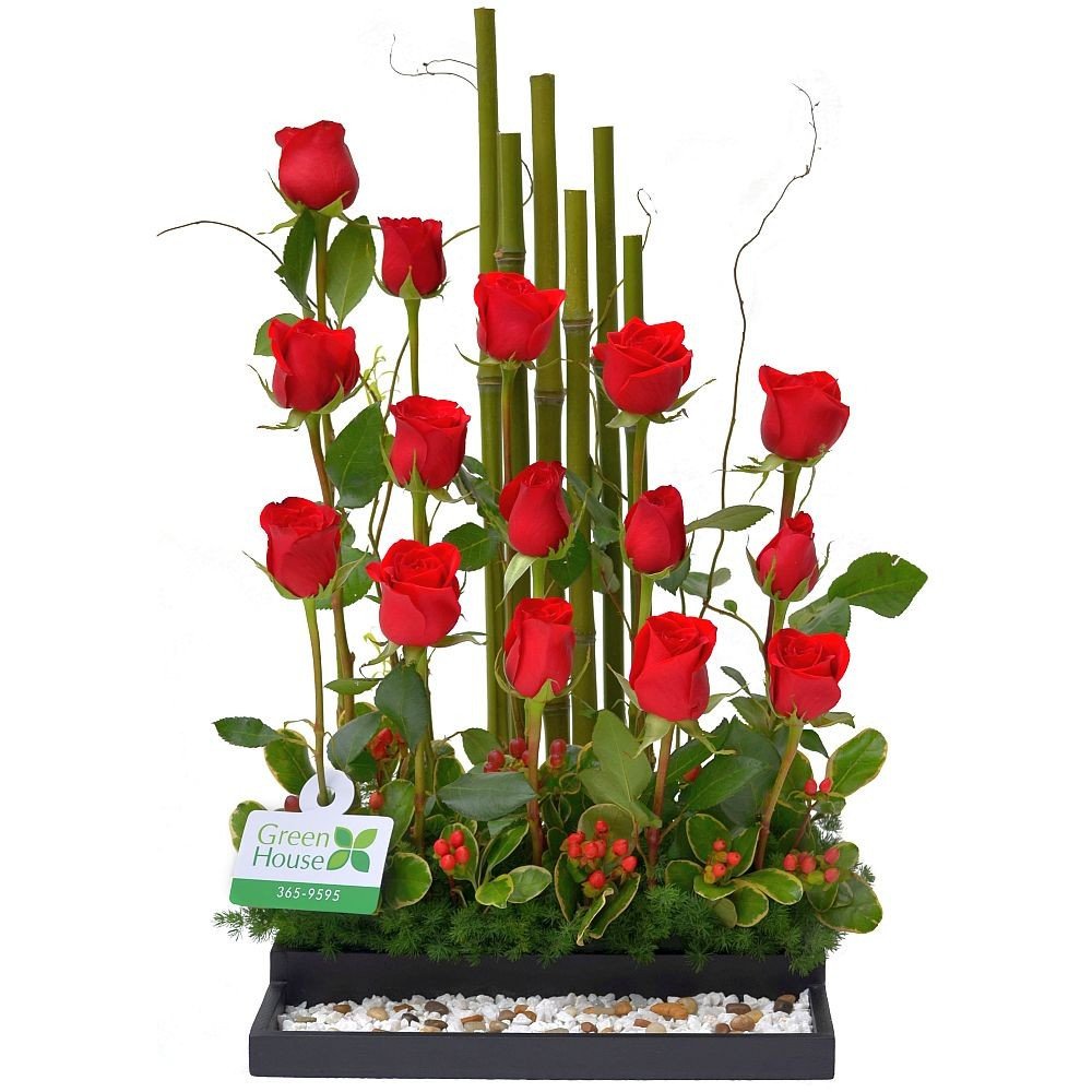 Arreglo estilo zen de 15 rosas en base de madera decorada con piedras. 65 cm alto. Color de las rosas según elección.