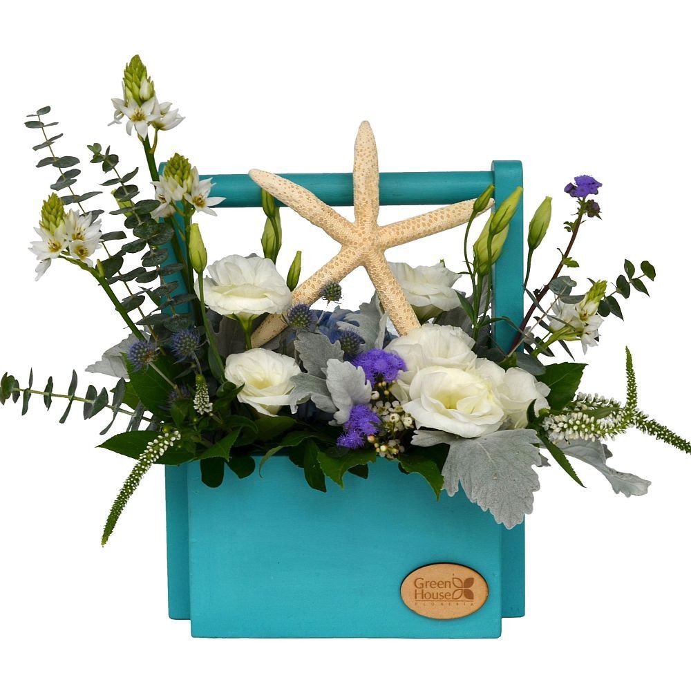 Delicado arreglo de flores variadas y follaje fino. Elaborado en revistero decorativo de madera decorado con estrella de mar. 35 cm. Alto.