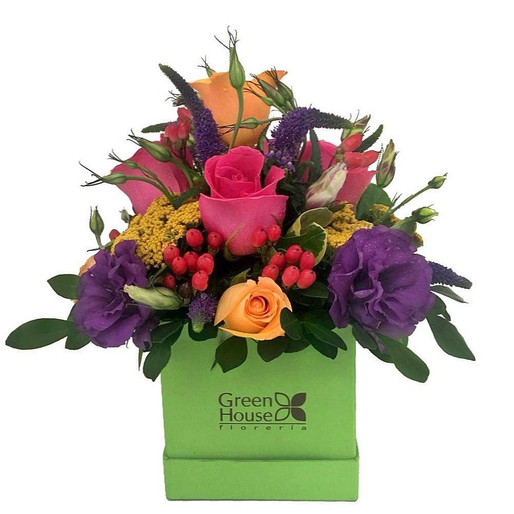 Colorido arreglo floral de rosas, flores variadas y follaje fino en box verde. 30 cm. Alto.