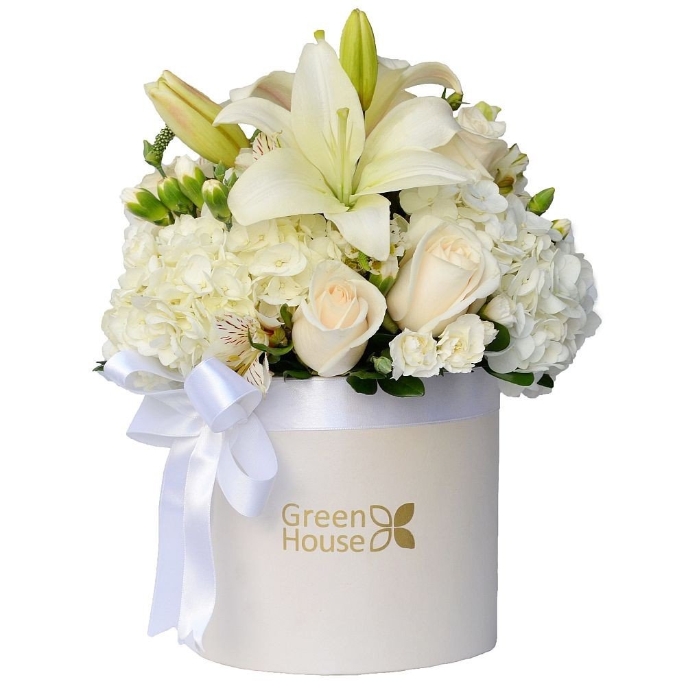 Arreglo de liliums, rosas, hortensias, astromelias y claveles baby, en base Luxury decorada con lazo. 30 cm. Alto.