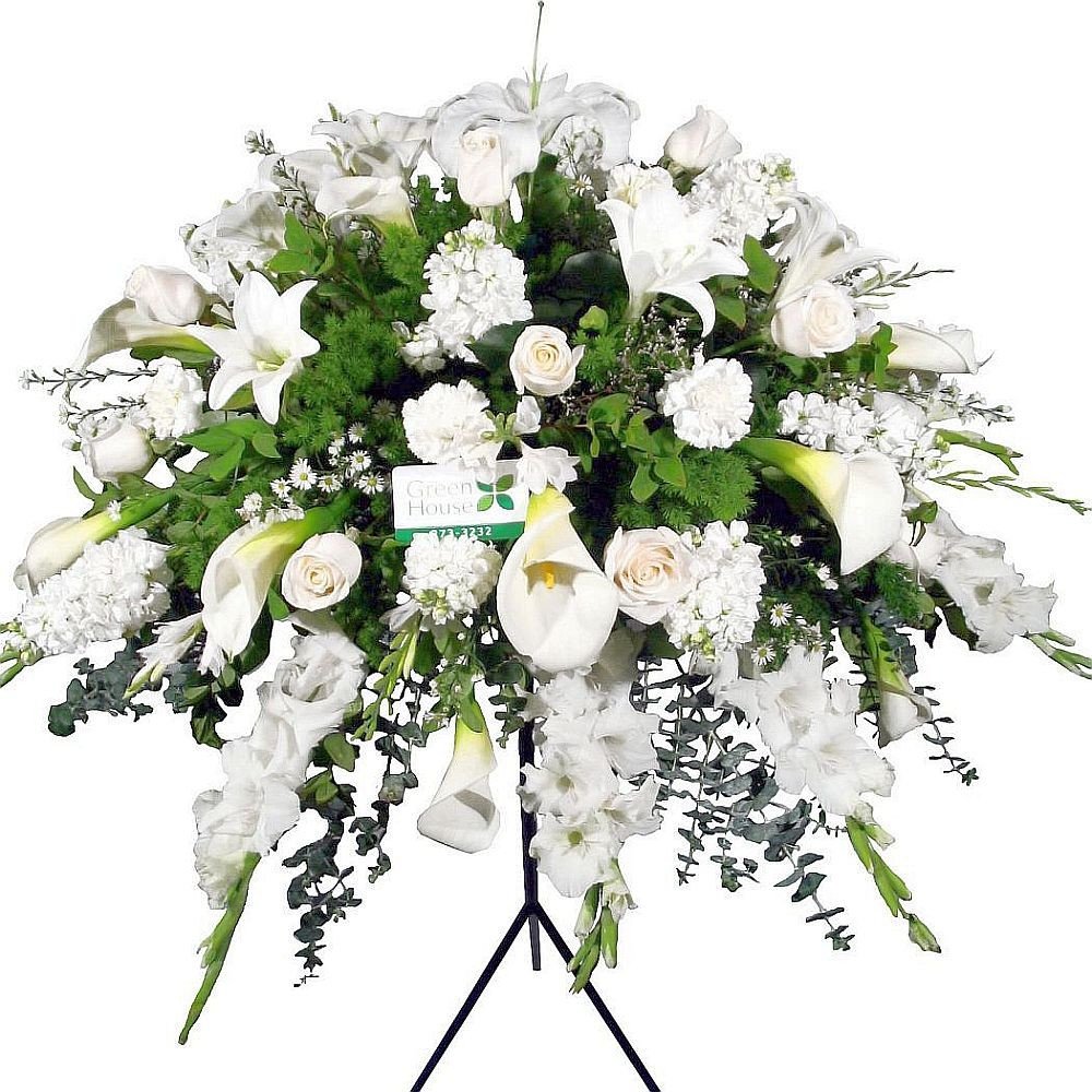 Manto especial con rosas, cartuchos, azucenas, liliums, alhelí, gladiolos, claveles y flores variadas. En pedestal de fierro. 1.40 mt.