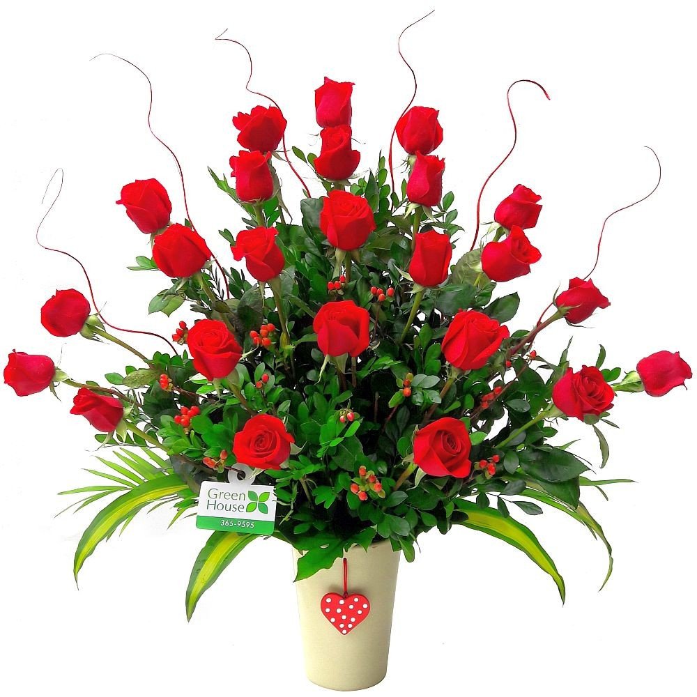 24 rosas y follaje fino en florero de cerámica. 85 cm. alto. Color de rosas según elección.