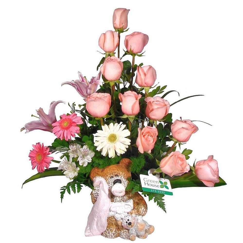 Arreglo floral para nacimiento compuesto por 12 rosas, gerberas y liliums, elaborado en fino florero de cerámica. 65 cm. de alto.