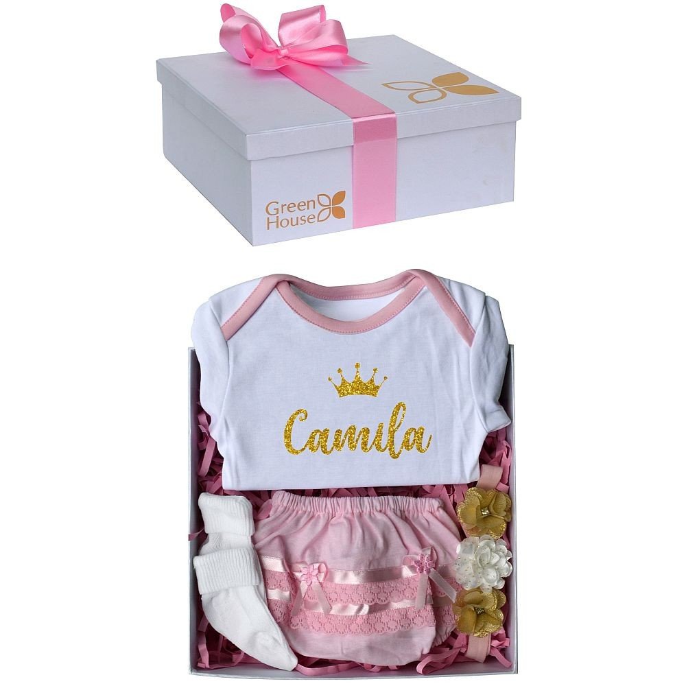 Delicado pack para bebe que incluye un body de algodón con nombre personalizable, una bombacha, una vincha y medias. En fina caja decorativa.
