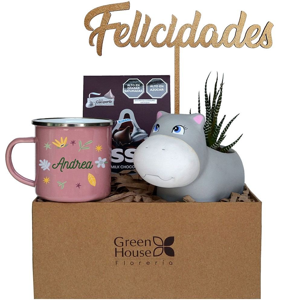 Exclusivo pack que contiene una taza vintage especial con nombre personalizable, un hipopótamo de cerámica con suculenta, chocolates Kisses Hershey´s de leche (74 gr.) y un topper Felicidades.