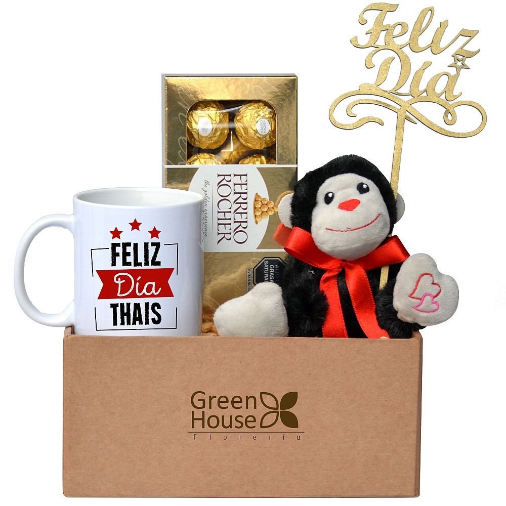 Desea un Feliz Día con este pack especial que contiene una taza personalizable, una caja con 8 Bombones Ferrero Rocher, un topper Feliz Día y un peluche (el modelo puede variar según disponibilidad).