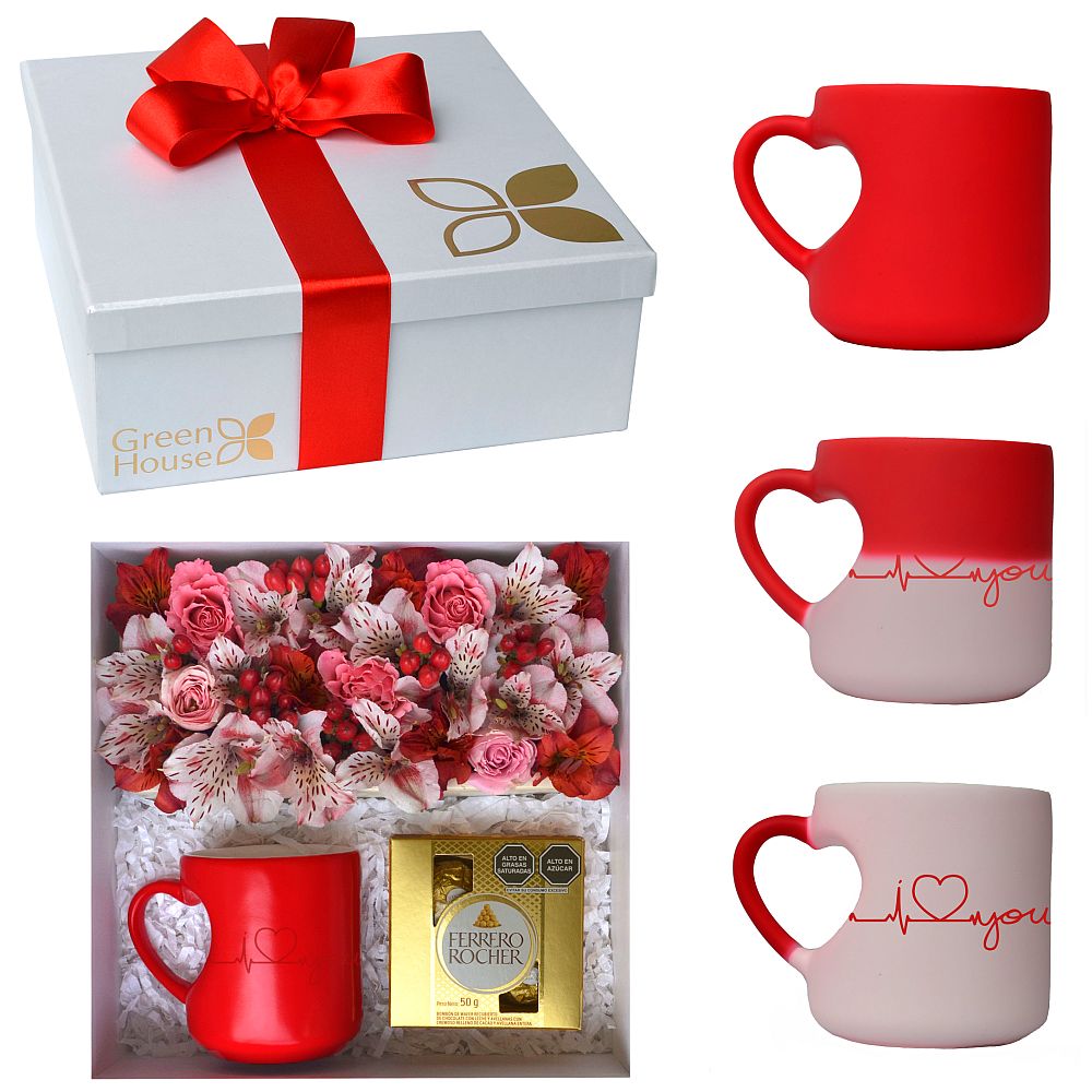 Exclusivo pack que contiene un arreglo de mini rosas, astromelias y follaje fino, una taza mágica especial (al ponerle agua caliente aparece el mensaje "I Love You") y bombones italianos Ferrero Rocher (4 unidades). En fina caja decorativa.