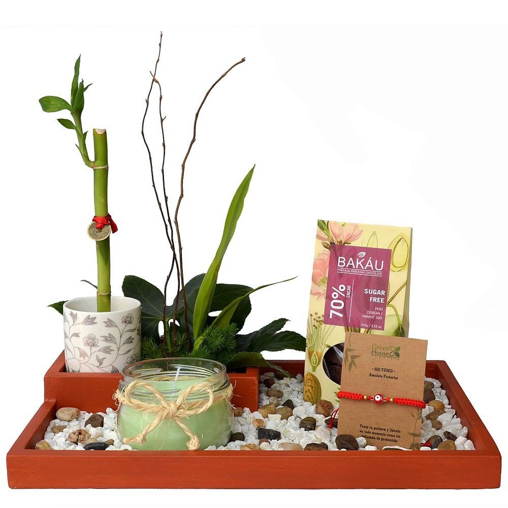 Exclusivo pack que contiene un Lucky Bamboo Oriental (1 Tallo), una pulsera con ojo turco (para la protección), una vela aromática de té verde y obleas de chocolate sugar free al 70% marca Bakáu (100 gr.). En base de madera decorada con piedras y follaje fino.