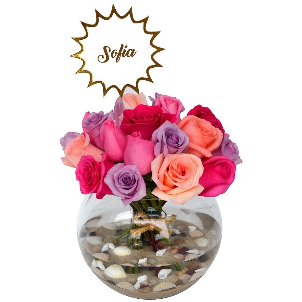 Exclusiva pecera de vidrio con 24 rosas, decorada con motivos marinos y acompañada de topper acrílico con nombre personalizable. 35 cm. alto (incluido el topper).