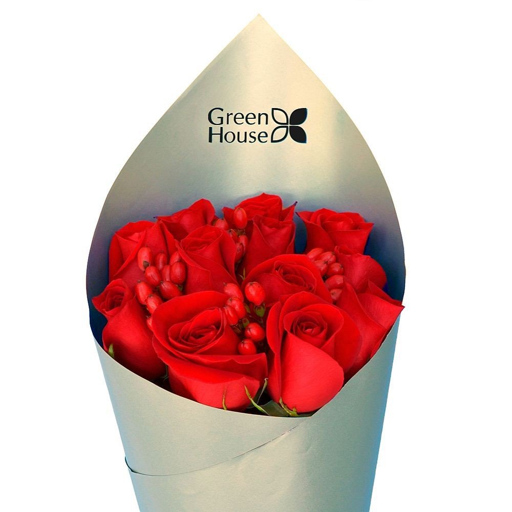 Exclusivo ramo de 12 rosas y follaje fino en papel decorativo especial color plateado. Color de las rosas según elección.