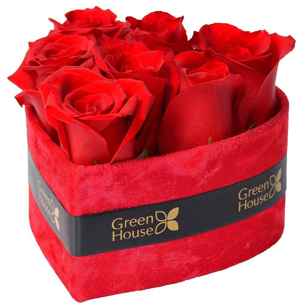 Delicado arreglo floral de 7 rosas rojas en base con forma de corazón. 13 cm. De alto.