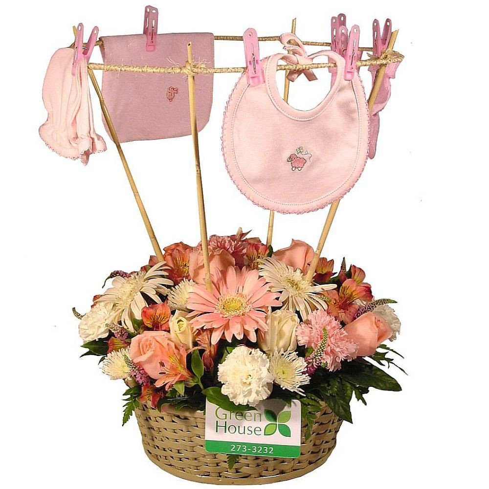 Contiene rosas, claveles, gerberas, astromelias y flores variadas, acompañadas de productos para la bebé (medias, babero, babita y mitones). 60 cm. alto.