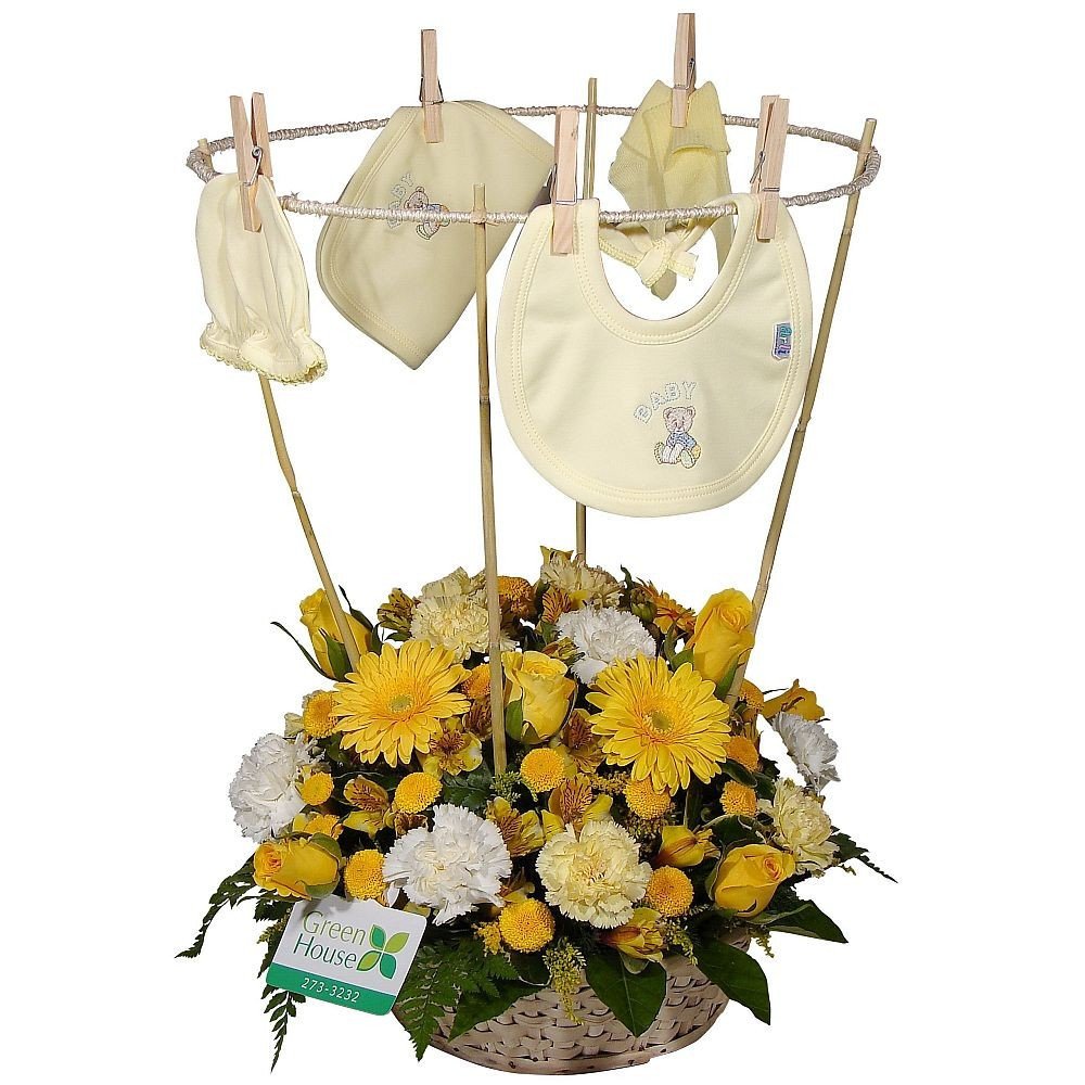 Contiene rosas, claveles, gerberas, astromelias y flores variadas, acompañadas de productos para el bebé (medias, babero, babita y mitones). 60 cm. alto.