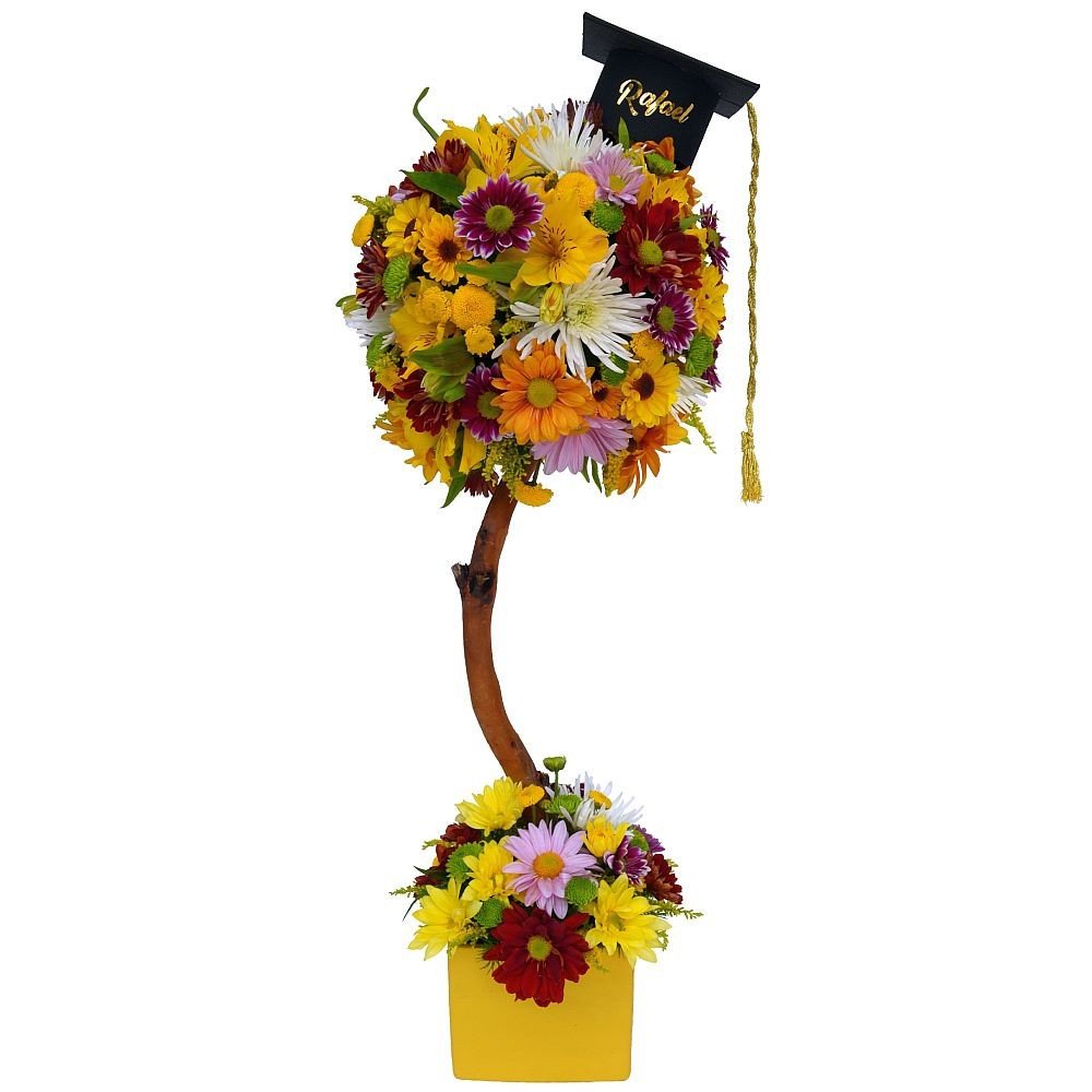 Delicado topiario de flores variadas decorado con birrete de graduación con nombre personalizable. Elaborado en florero de cerámica. 60 cm. alto.